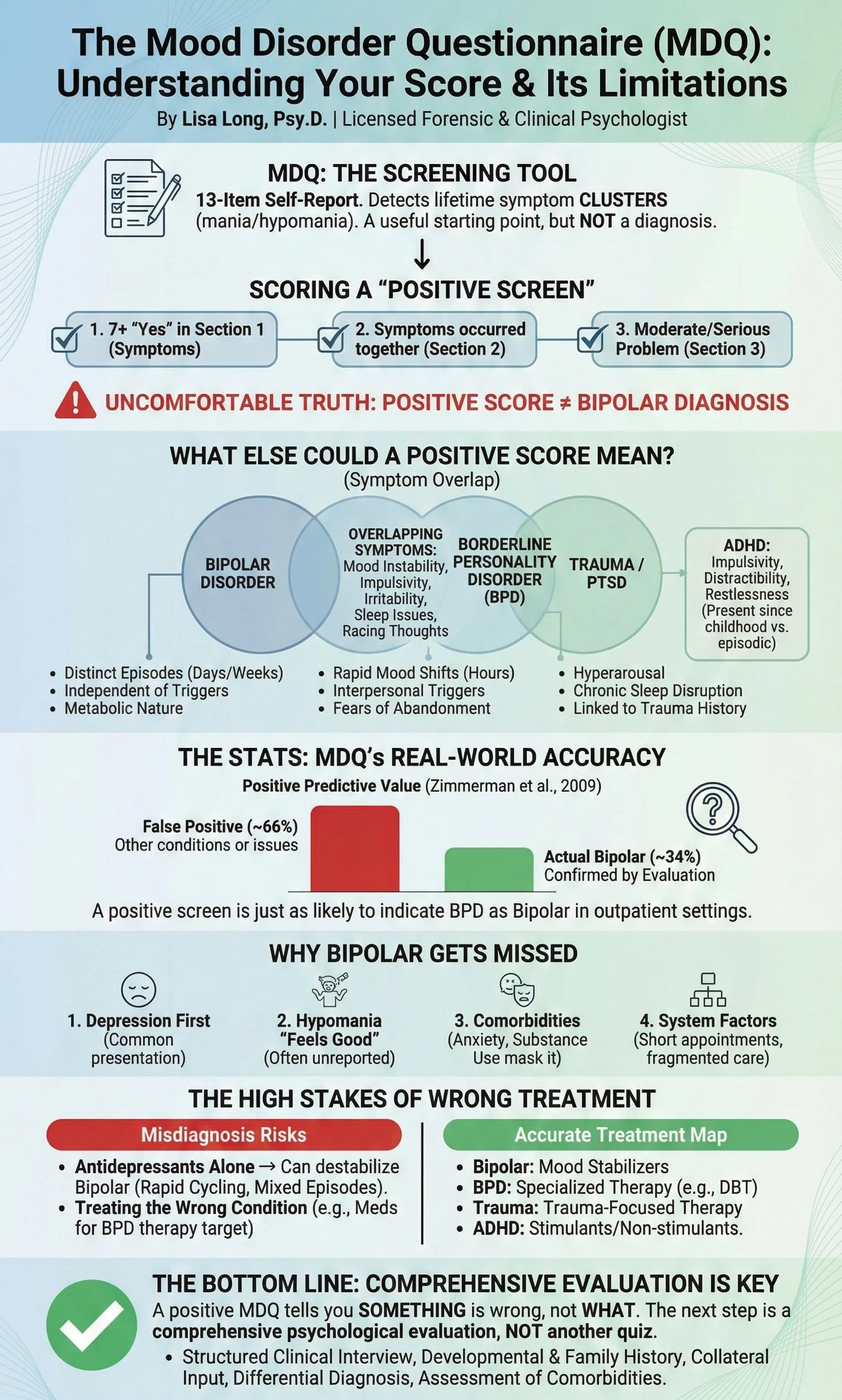 The MDQ is a screening tool, not a diagnostic test. A positive score indicates the need for comprehensive evaluation—nothing more. With a positive predictive value around 34%, only about one-third of people who screen positive actually have bipolar disorder (Zimmerman et al., 2009). The tool cannot reliably distinguish bipolar disorder from borderline personality disorder (Zimmerman et al., 2010), and it misses the nuanced differential diagnosis required for accurate treatment planning.